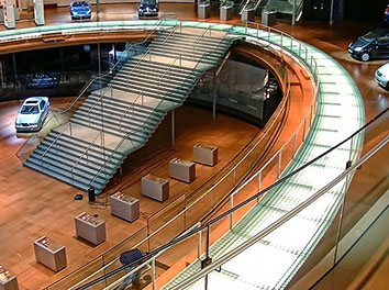 Montage der Glasgeländer, Treppenläufe, Glasstehlen, Displays, Trennwände, Glastüren usw. mit Spezial-Kränen, Hubbühne etc.