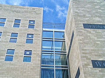Verbindungshalle Neubau/Altbau - Glasdach und Fassade tw. mit Brandschutzglas verglast mit einem „Nadelkran“ und Saugbatterie