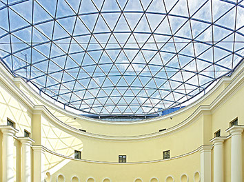 Verglasung von Dach und Fassade mit Pfosten/Riegelkonstruktion in bis ca. 15 m Höhe.